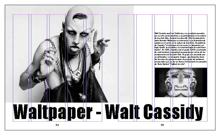 Para la composición de la página he utilizado una retícula de cinco columnas con un medianil de 4 milímetros. Este tipo de composiciones con columnas impares permiten un mayor dinamismo a la hora de componer y me permite más fácilmente jugar con la asimetría en las páginas.