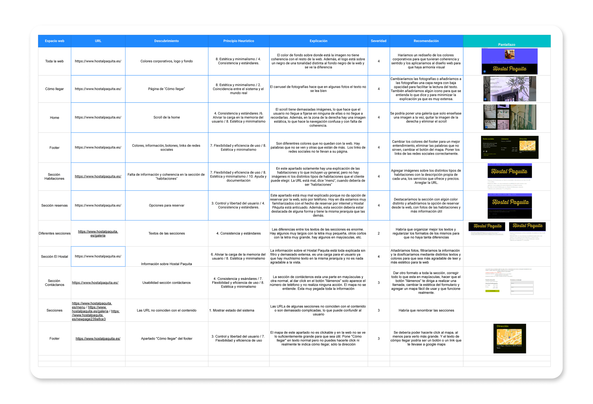 Siguiendo las leyes heurísticas de Nielsen, analizamos algunos de los errores de usabilidad de la web de Hostal Paquita y los categorizamos según el principio heurístico al que falta, su severidad y algunas ideas para mejorarlo.