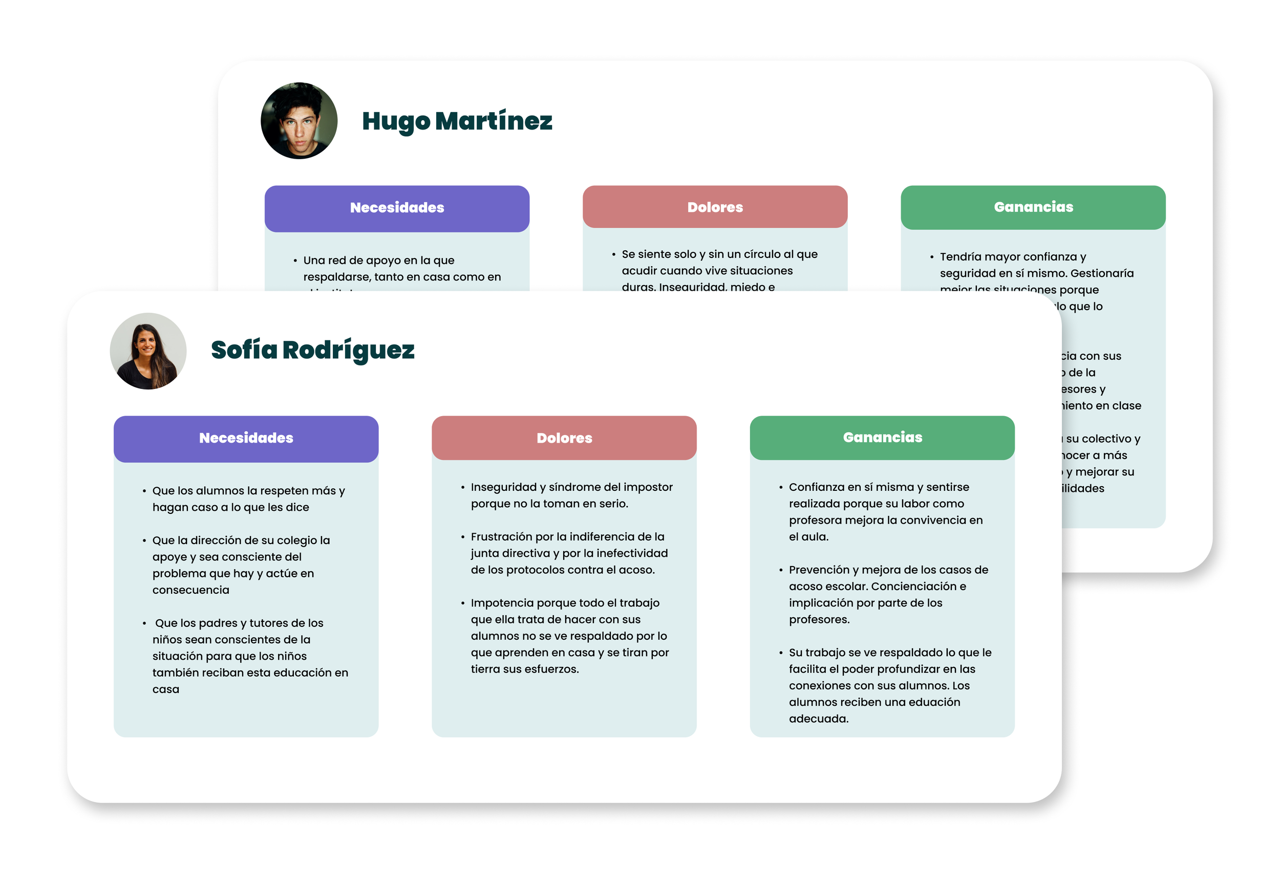 En esta fase, el objetivo es tomar toda la información recopilada durante la fase de "Observar" y organizarla en una comprensión más clara y significativa del problema. Se trata de un proceso de análisis y síntesis de la información para identificar patrones, tendencias y oportunidades de diseño. Desarrollamos las Personas de Sofía, una profesora que trata de colaborar en su instituto para mejorar la convivencia entre sus alumnos, y de Hugo, un alumno que sufre bullying por parte de sus compañeros debido a su orientación sexual. De esta forma, conseguimos empatizar con el usuario y concretar sus necesidades para más tarde poder implementarlas en nuestro diseño.